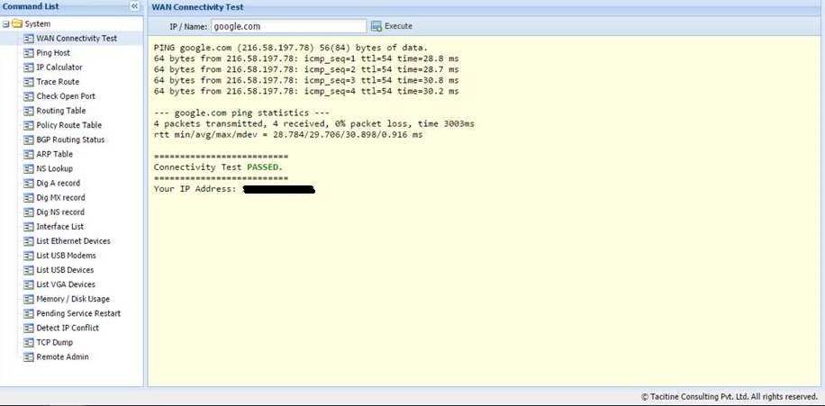 Step 2 :connectivity check status > Troubleshoot > system command >wan connectivity test