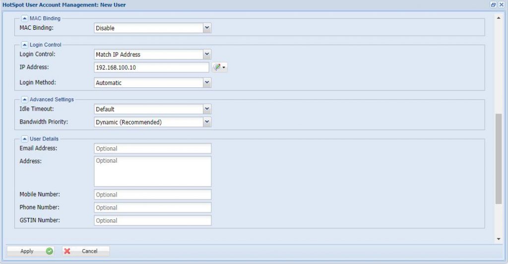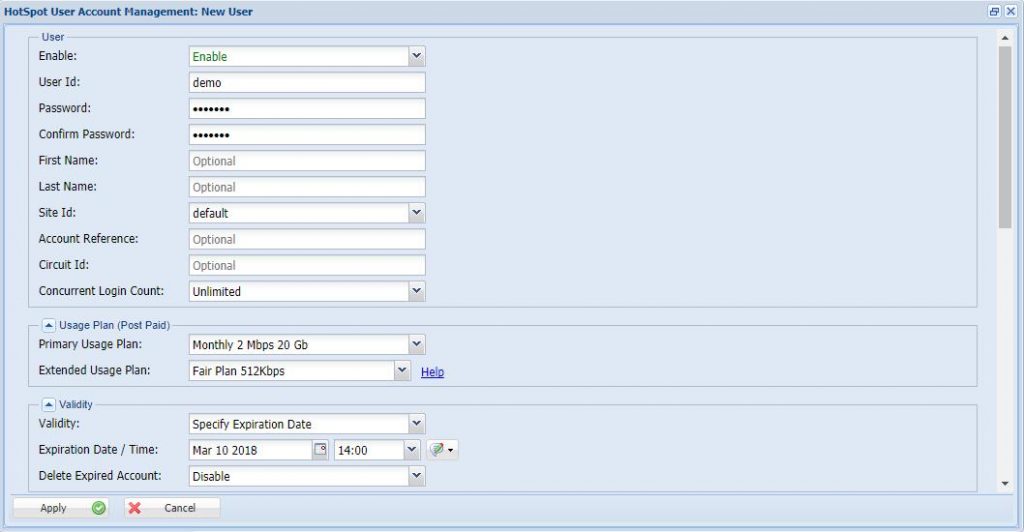 Hotspot User Management is used to manage all the users’ Plans, their credentials and login control.