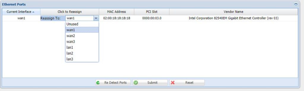list the Ethernet port available > click to resign dropdown select the interface want to remap it