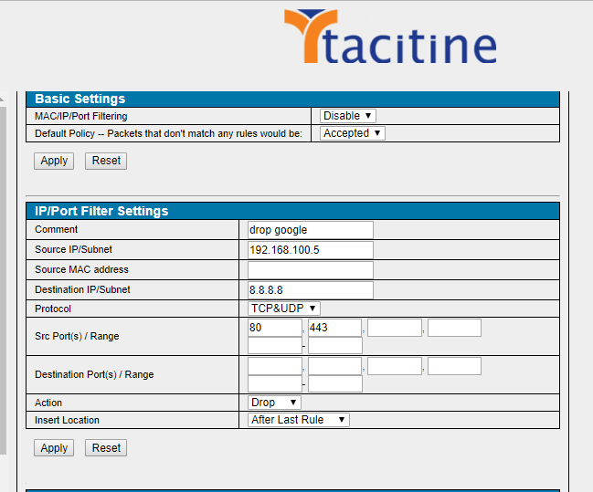 Step 1: Log in to the Tacitine. (If you are configuring the Tacitine for the first time, the default Lan IP is http://192.168.100.1) and default username: admin & Password: admin99