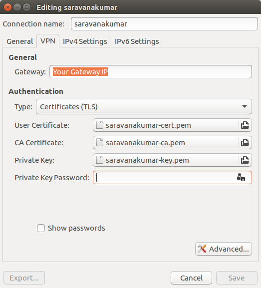 Step 4: After import the Ovpn the edit the connection setting we can to see the VPN tab, in general, it the Gateway mention the Wan IP of the head office and make all setting are default in private Key Password it asks the Password mention the key where we see when to create and download the client