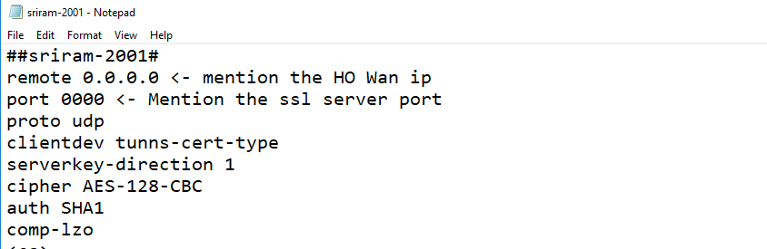 Note: From version 18.4 onward we can see the Ovpn file in zip folder extract it and open the ovpn file in notepad we can see the remote IP is mention as 0.0.0.0 there mention the wan IP and port also show 0000 there mention port number mention in the SSL server creation time