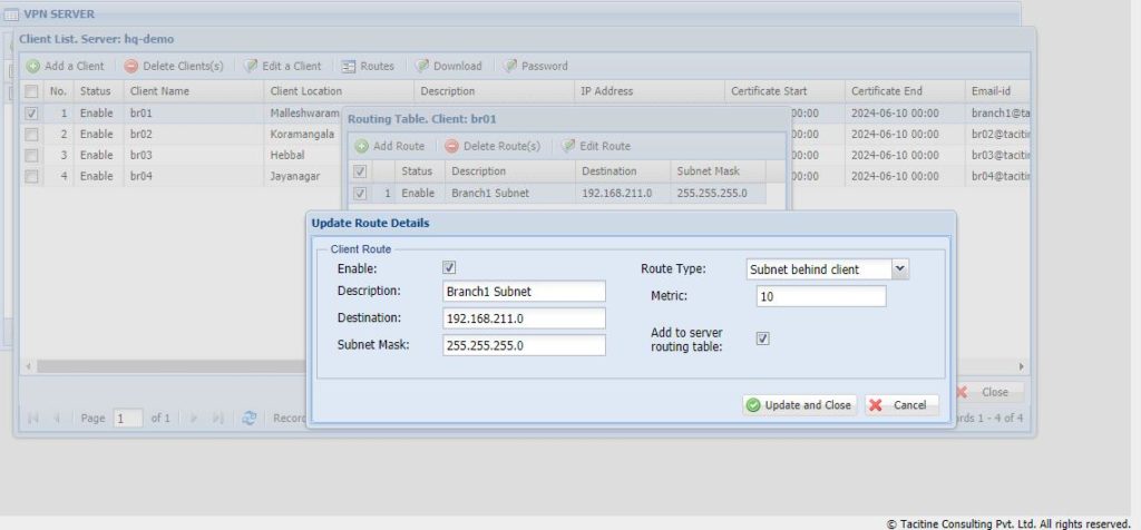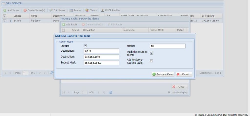 Step 19: Select the Route Type subnet behind Client and Select Add server routing table