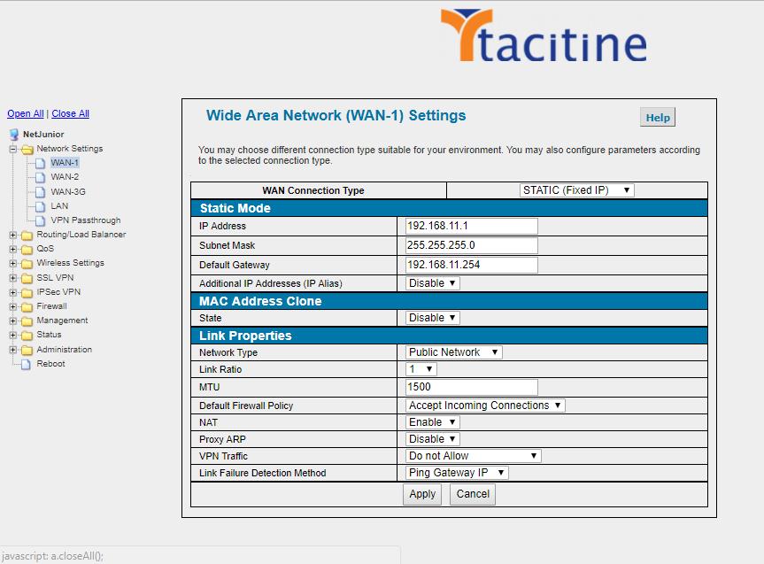 1. Login to the Tacitine. (If you are configuring the Tacitine for the first time, the default Lan IP is http://192.168.100.1) and default username: admin & Password: admin99
